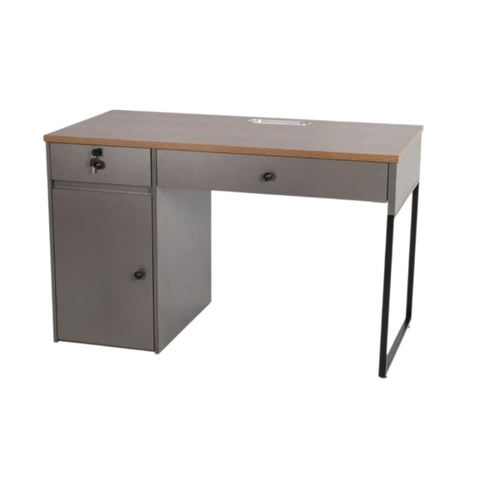 يتميز سطح المكتب بتصميم خشبي ناعم بلون بيج دافئ، مما يوفر مساحة واسعة للكتب، الكمبيوتر، ومستلزمات الدراسة أو العمل. أما الجزء السفلي، فيأتيك بخزانة جانبية عملية ومقسمة بشكل ذكي. تضم الخزانة درجًا علويًا مزودًا بقفل للحفاظ على خصوصية أغراضك المهمة، ويقع أسفله باب يفتح على مساحة تخزين إضافية لتنظيم ملفاتك أو أدواتك.