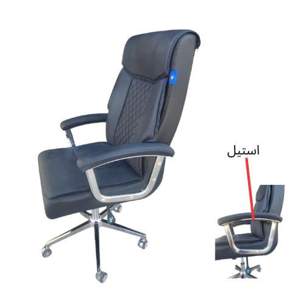 الصور المعروضة تظهر كرسي مكتب باللون الأسود، يتميز بتصميم فخم ومريح. الكرسي مزود بذراعين وقاعدة متحركة بعجلات، مما يوفر سهولة في الحركة والتنقل. الجزء المشار إليه في الصورة المصغرة باللغة العربية بكلمة "استيل" (Steel) هو الذراع المصنوع من المعدن اللامع، مما يضفي لمسة عصرية وفخمة على التصميم.