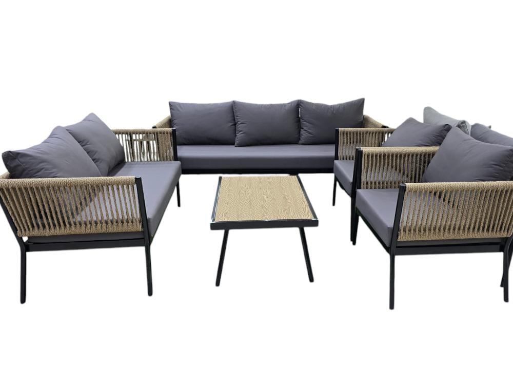 1كرسي ثلاثي ٢١٠سم ١كرسي ثنائي ١٥٥شم 2كرسي مفرد 85سم ١طاولة 100×70سم جلسة حديد منسوج بالحبال قوية ومتينة