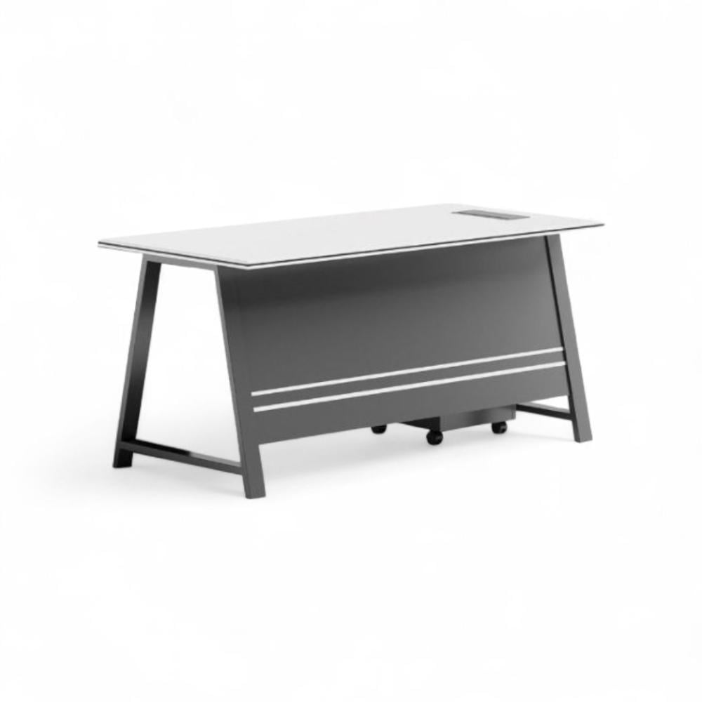 طاولة مكتبية عصرية بتصميم أنيق، سطحها أبيض وأرجلها رمادية داكنة، مع وحدة تخزين متحركة بثلاثة أدراج.