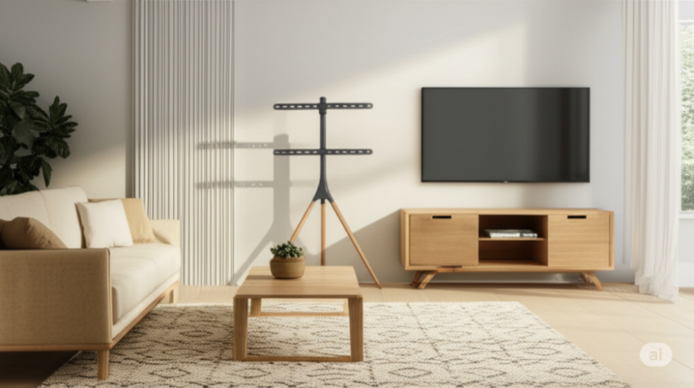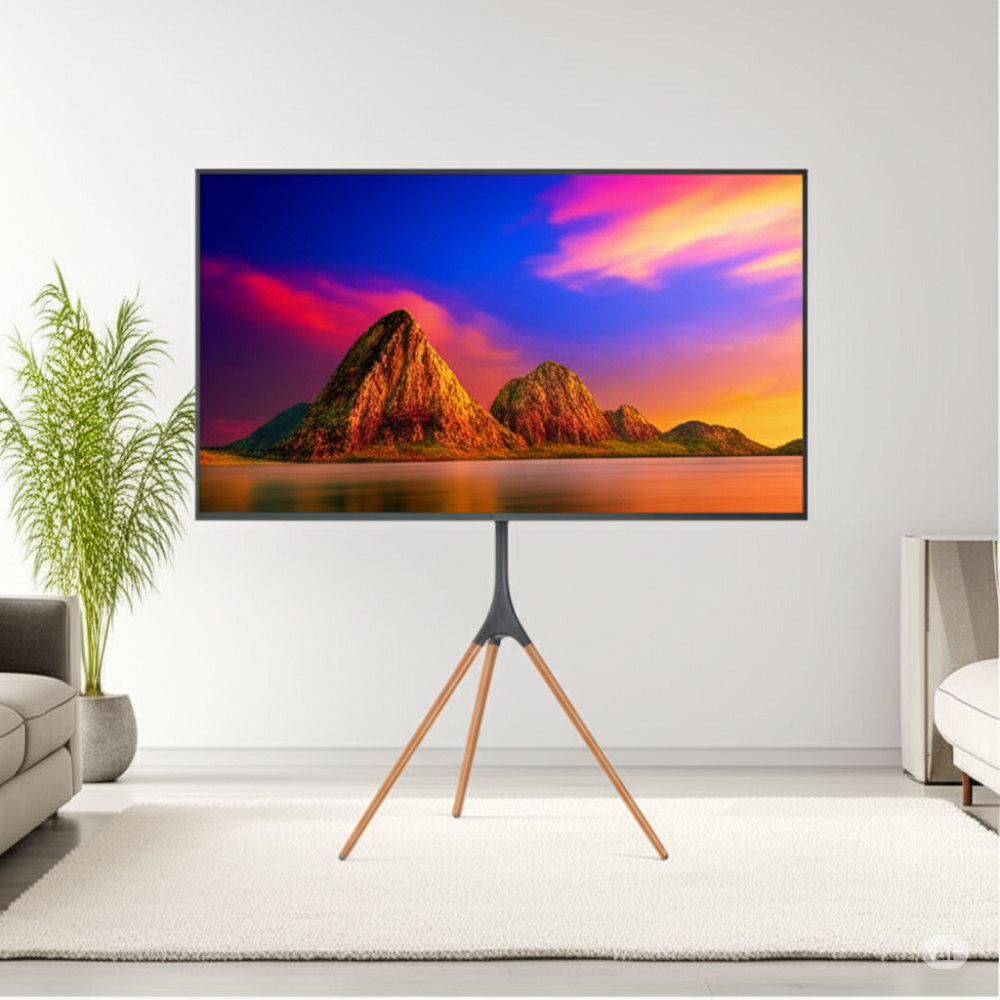 يتميز هذا الحامل بتصميمه المبتكر الذي يجمع بين الخشب والمعدن، مما يمنحه متانة وعصرية في آن واحد. يوفر الحامل قاعدة ثابتة وآمنة لتلفازك، مع إمكانية تعديل موضع الشاشة لتجربة مشاهدة مثالية.