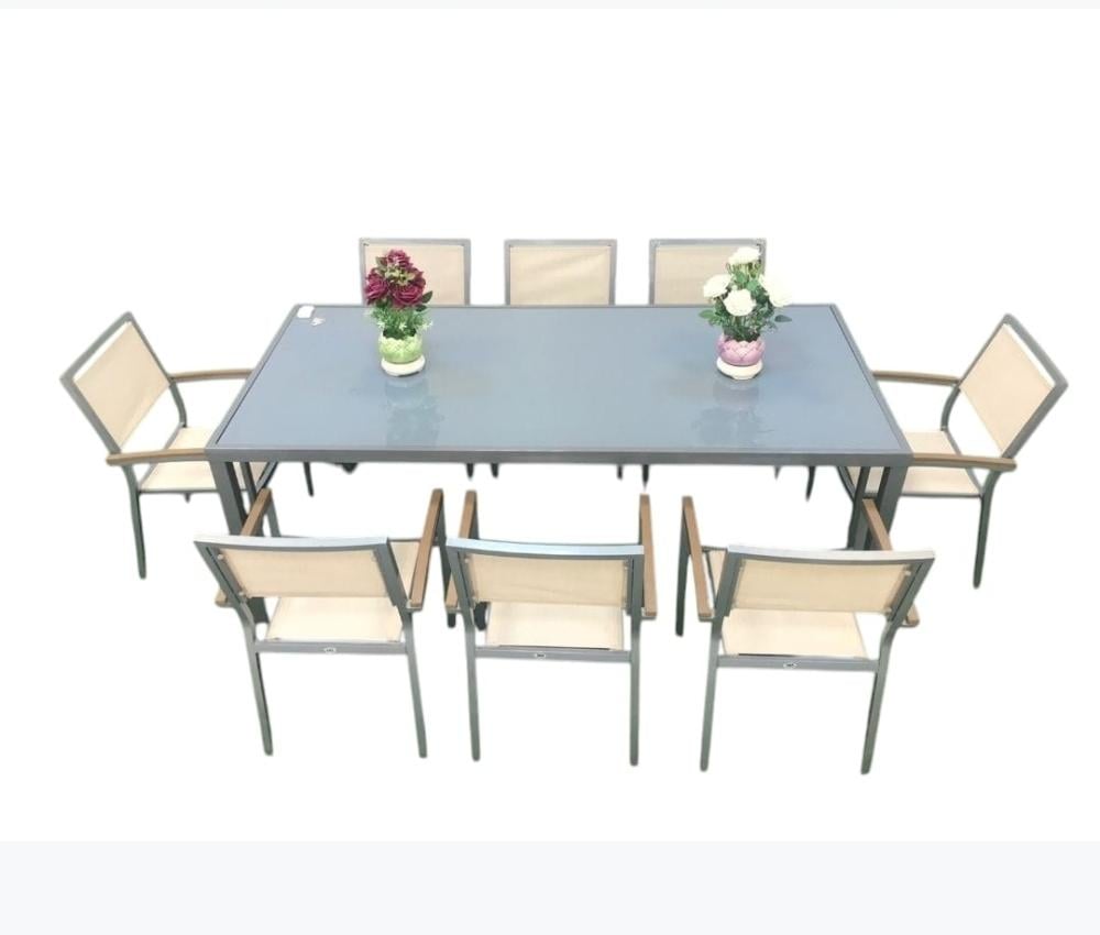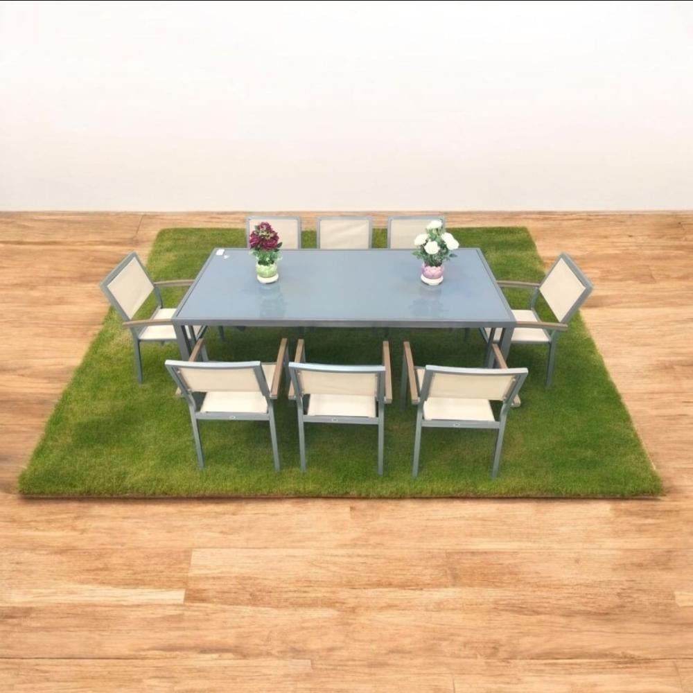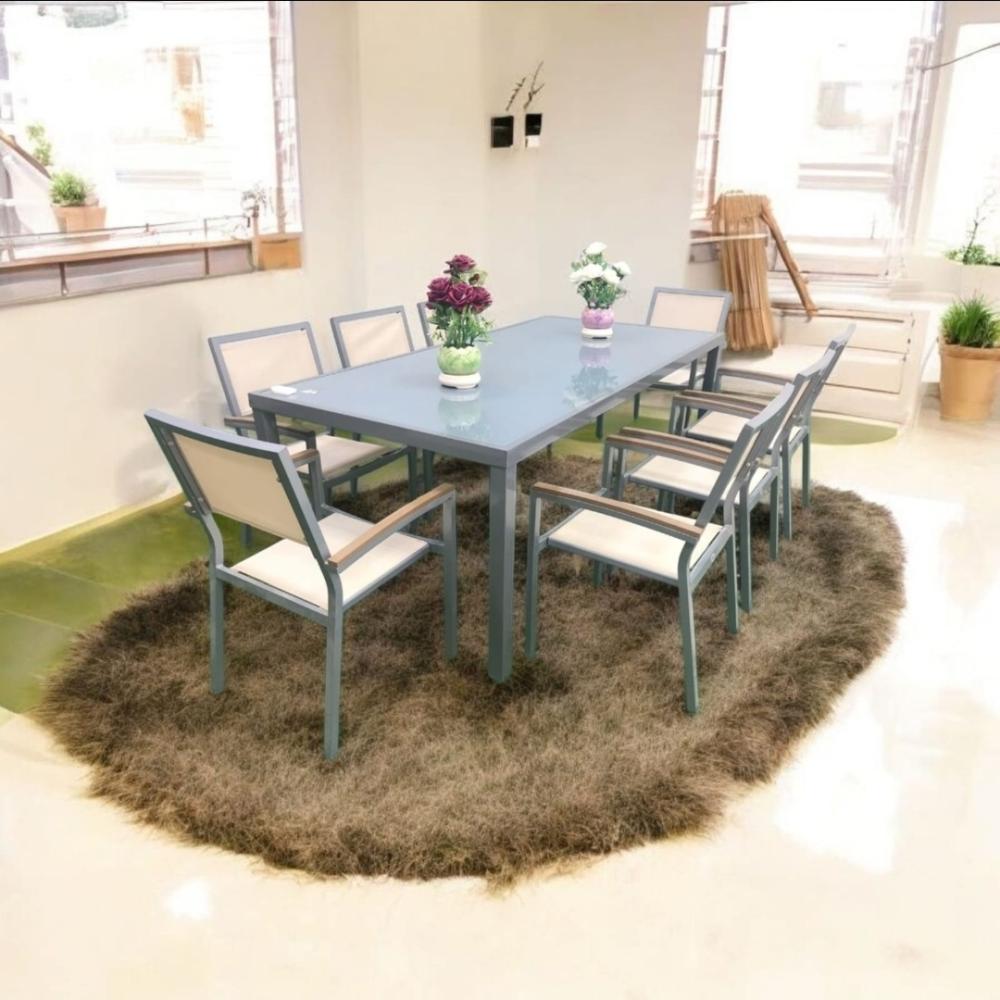 ارفع مستوى مساحتك الخارجية مع طقم طاولة الطعام الفاخر هذا، المصمم ليجمع بين الأناقة والمتانة. استمتع بلحظات لا تُنسى مع العائلة والأصدقاء في حديقتك أو شرفتك، حيث يضفي هذا الطقم لمسة من الرقي على أي مناسبة.